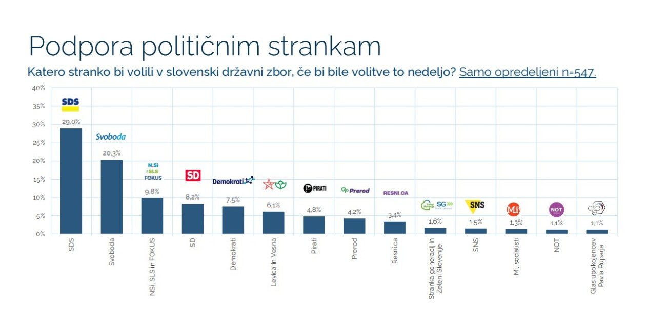 Na vprašanje “Katero stranko bi volili v slovenski državni zbor, če bi bile volitve to nedeljo?” (Samo opredeljeni n=547) pa so bili odgovori sledeči: med opredeljenimi, bi SDS dobila 29,0 %, Svoboda 20,3 % ter združene NSi, SLS in Fokus 9,8 %.