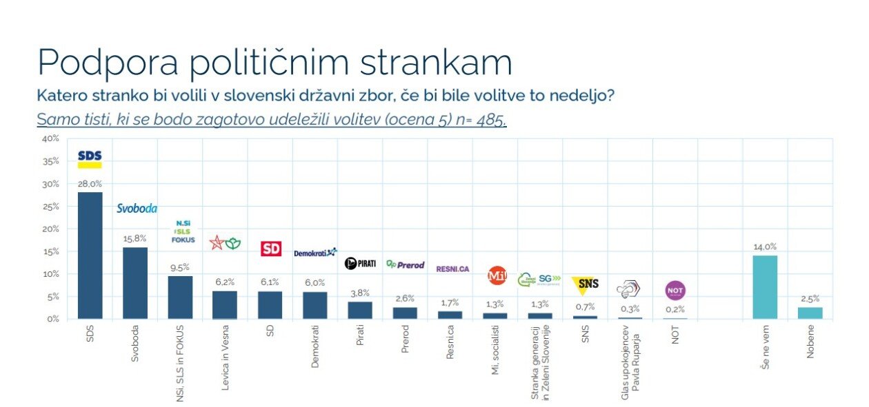 Na vprašanje “Katero stranko bi volili v slovenski državni zbor, če bi bile volitve to nedeljo?” (samo tisti, ki se bodo zagotovo udeležili volitev (ocena 5) n= 485) pa so bili pridobljeni sledeči rezultati: med tistimi, ki se bodo zagotovo udeležili volitev, bi jih največ (28,0 %) podprlo SDS, sledi Svoboda (15,8 %), združene NSi, SLS in Fokus (9,5 %), združeni Levica in Vesna (6,2 %), SD (6,1 %) in Demokrati (6,0 %).