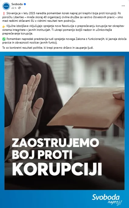 Tomšič je uvodoma izpostavil ogromno sprenevedanja oblasti, sploh po tem, ko je po vseh razkritjih domnevne korupcije iz kroga Gibanja Svoboda, prav ta ista na Facebooku objavila zapis, kako je “Slovenija je v letu 2025 naredila pomemben korak naprej pri krepitvi boja proti korupciji”.