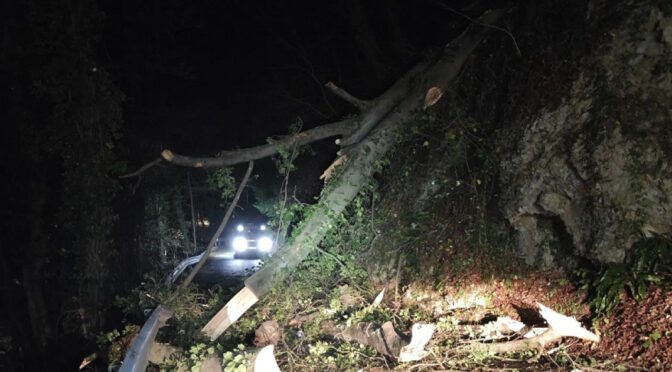 Izvozili so s tremi gasilci tehničnimi reševalci in dvema voziloma. Po prihodu na kraj dogodka so opravili hitri ogled in zavarovali mesto nesreče. Pri ogledu so ugotovili, da sta na cesto padli dve drevesi in oplazili mimo vozeče osebno vozilo. Drevesi so odstranili s cestišča in sprostili promet. Obveščene so bile vse pristojne službe. V enoto so se vrnili ob 05.51 uri.