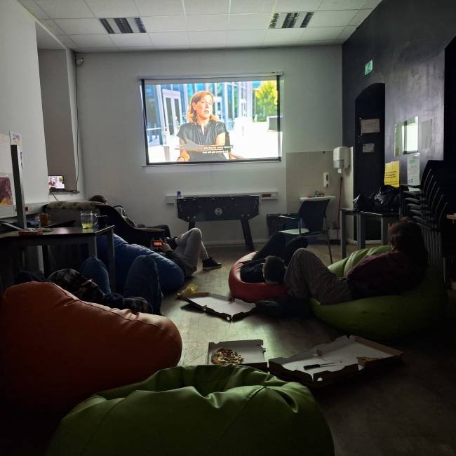 Po delavnici so se lotili snemanja svojih videov. Nekateri so delali individualno, drugi so se povezali v manjše skupine in si med seboj pomagali pri postavitvi kadrov, snemanju in ustvarjanju dodatnih vizualnih elementov. Bilo je izjemno zanimivo opazovati njihovo ustvarjalno energijo in predanost delu! Zvečer smo se sprostili ob ogledu dokumentarnega filma “The YouTube Effect”, ki prikazuje vpliv YouTuba na ustvarjalce in družbo kot celoto. Po ogledu smo se pogovarjali o izzivih in odgovornostih, ki jih prinaša ustvarjanje vsebin za širšo javnost.