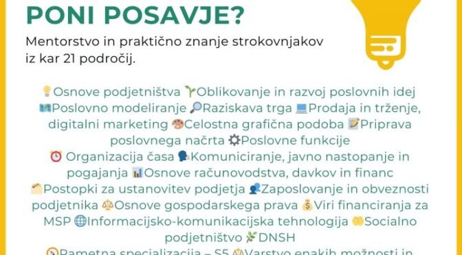 Gre za program, ki spodbuja razvoj podjetniških idej in samozaposlovanje v regiji. Udeležencem nudi mentorstvo ter praktična znanja strokovnjakov s kar 21 vsebinskih področij – od razvoja poslovne ideje, trženja in financ do prava in digitalnih orodij.