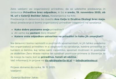 https://www.posavskiobzornik.si/images/imgKatalogIzdelek/min/401063.jpgGalerija Božidar Jakac, Center za podjetništvo in turizem Krško in Ekologi brez meja vabijo na izobraževanje za organizatorje prireditev z naslovom Prireditve brez odpadkov, ki bo v sredo, 19. 11., ob 16. uri v Galeriji Božidar Jakac. Predavanje in delavnico bo izvedla Ana Golja iz Društva Ekologi brez meja.