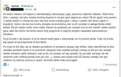 Dodaten dokaz, da ne gre za izoliran incident in da za “jajčnimi napadi” stoji lokalna mladina, pa je najti na spletu. Zgornja objava izvira iz družbenega omrežja Facebook, kjer imajo prebivalci Savskega naselja svojo skupino. Danes se je oglasila spletna uporabnica, ki je bila prav tako žrtev napada z jajci. “V petek zvečer in včeraj sta nam ista dva mulca metala jajca v okna, v petek celo skozi odprto v kopalnici. Vemo, da sta dva mulca starejša osnovnošolca, ker so ju sosedje iz našega bloka videli bežati,” je zapisala.