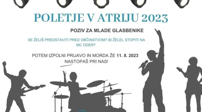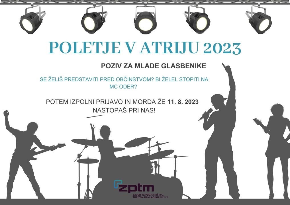 Poziv je odprt od 4. 7. 2023 do 25. 7. 2023 do 13. ure. ‼️ Jasna navodila in pogoji za prijavo so navedeni v »Javnem pozivu Poletje v atriju 2023 MC Brežice«, ki je na voljo tu: https://www.mc-brezice.si/novice/poletje-v-atriju-2023