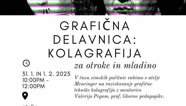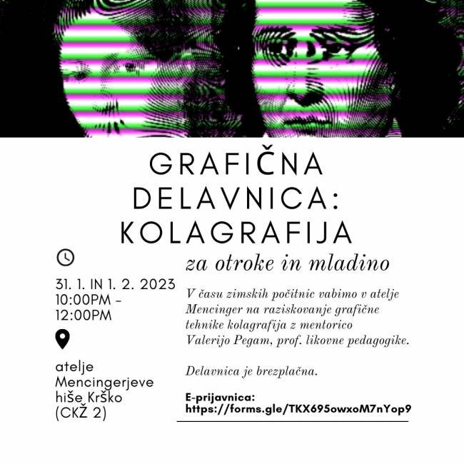 JSKD Krško obvešča, da imajo za otroke, željne ustvarjanja, še nekaj praznih mest v dvodnevni počitniški delavnici grafične tehnike kolagrafija. Ta bo potekala v ateljeju Mencingerjeve hiše z mentorico Valerijo Pegam, prof. likovne pedagogike. V duhu prihajajočega slovenskega kulturnega praznika bodo udeleženci ustvarili portret Franceta Prešerna in Julije Primic in pri tem raziskovali različne možnosti kombiniranja globokega in visokega tiska.