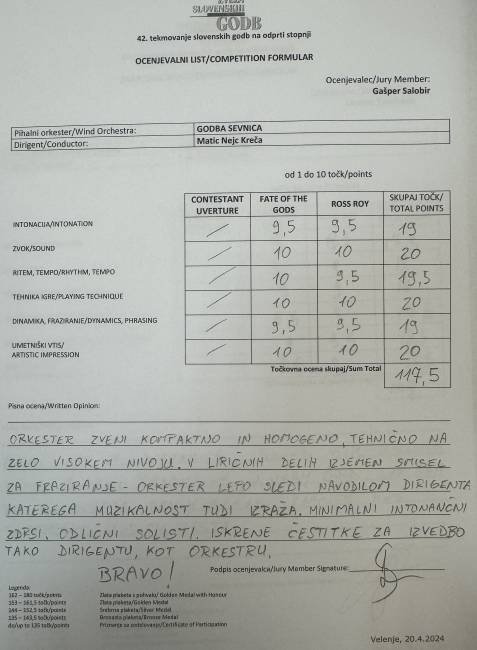 V soboto, 20. aprila 2024, je v velenjski Glasbeni šoli Fran Korun Koželjski potekalo 42. tekmovanje slovenskih godb v različnih težavnostnih stopnjah ter mladinski kategoriji, kjer je nastopilo tudi KD Godba Sevnica pod vodstvom dirigenta Matica Nejca Kreče.