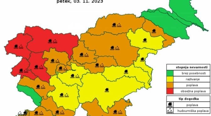 Rdeči alarm (obsežna poplava) je zaenkrat razglašen le za skrajni severozahod države, sever in jug države sta na opozorilni karti obarvana oranžno (poplava), območje Posavja pa je rumeno, kar pomeni razlivanje rek na običajnih mestih. Naj tako tudi ostane …
