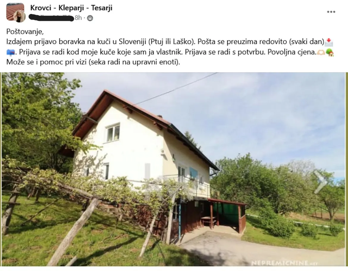 Na družbenem omrežju Facebook se je pred časom pojavil oglas, v katerem oseba ponuja možnost prijave prebivališča v njeni hiši. Sodeč po zapisanem naj bi šlo za hišo v okolici Ptuja ali Laškega, za pobiranje pošte naj bi bilo poskrbljeno. Pravi, da je “cena ugodna” in da z vizo lahko pomaga njena sestra, ki dela na upravni enoti.