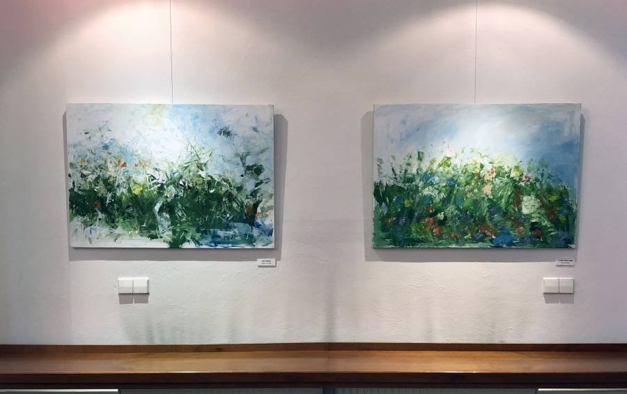 Razstavljena akvarelna in oljna platna obiskovalca popeljejo na razcvetela travniška polja, ob morje, v katerem se zrcalijo obrisi hiš in zibajoča plovila, med abstraktne zarisane linije, pod kamniti most, vpet med hiše nad tolmunom, iz posodja je mogoče domala vonjati barvito okrasno cvetje … Razstavljene slike, ki so v dvorani na ogled še do 18. julija, so ustvarili: Kristina Bevc, Janez Klavžar, Liljana Čuček Femec, Nataša Močnik, Jožica Pavlin, Branka Pirc, Tatjana Potokar, Erika Puc, Vilma Siter in Lidija Stipanič.