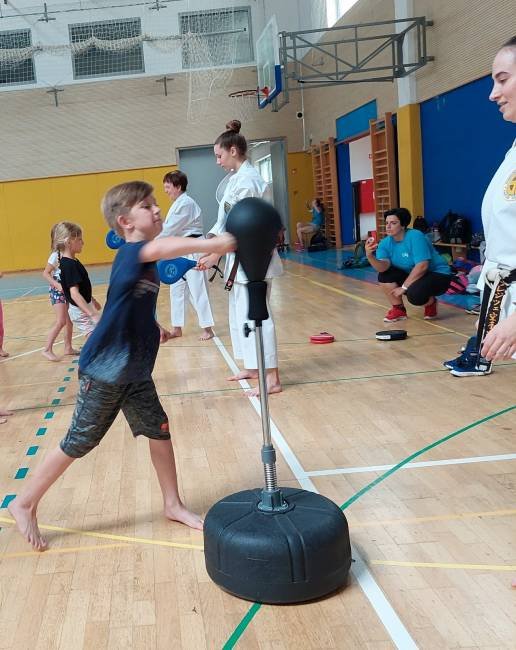 Po borbenem ogrevanju so sledile demonstracije blokov in udarcev in delo z rekviziti. Trening sta popestrili tekmovalki Maja Lazanski in Maja Lakner, ki sta otrokom prikazali kato Papuren. Otroci so med demonstracijo zadrževali dih, dekleti pa spremljali s široko odprtimi očmi in šteli njune nevidne nasprotnike. Nato so se naučili kratko kato in ji dali svoje ime. Na koncu so se preizkusili še v borbenih tehnikah na tarčo in navdušeno povprašali obe reprezentantki o njuni športni poti, saj sta postali marsikateremu mlademu športniku velik navdih. Ob koncu so se sprostili z borbeno igrico.