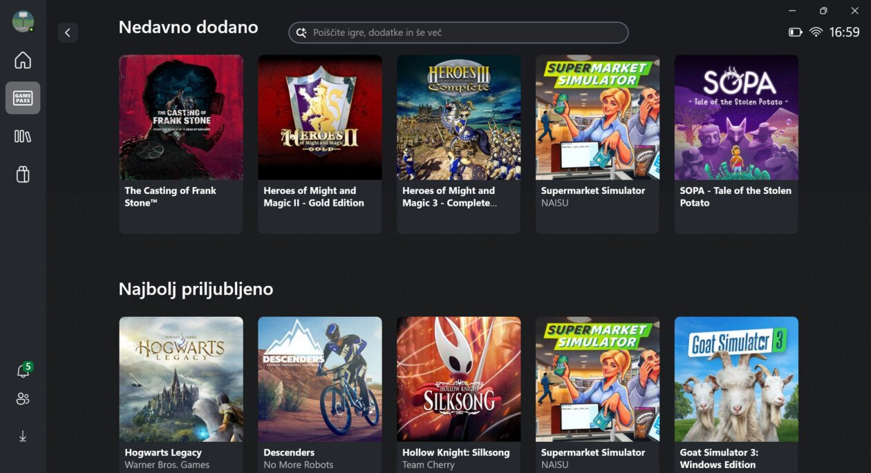 Nov Xbox vmesnik, ki je na voljo na novem ASUS ROG Xbox Ally X (na voljo bo tudi na drugih Windows ročnih računalnikih), in do katerega dostopamo z novim Xbox gumbom, meni bolj deluje kot čisto običajen celozaslonski način s poudarkom na enostavni dostopnosti do naloženih programov in iger. Ko klikneš dvakrat na ta gumb, Windows 11 izgine (še vedno se izvaja v ozadju) in namesto njega imaš na levi strani meni s hitrimi bližnjicami do vsega, kar boš rabil (trgovina, Game Pass, knjižnica, vse za družabnost …). Še vedno lahko zaganjaš programe (na primer Adobe, Word) in dostopaš do vseh iger iz vseh knjižnic (Steam, Epic, GOG …).