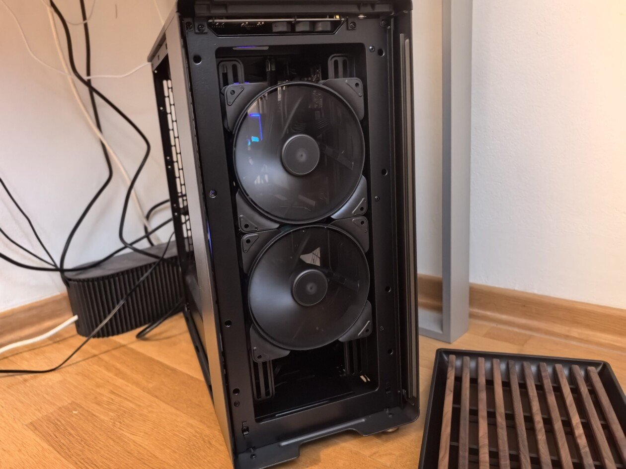 Kaj drugega od dobrega pretoka zraka od tega ohišja nisem pričakoval. Ogromna prostornina, zračne stranice naredijo tisto razliko, ki jo pri manjših in bolj zaprtih ohišij pogrešaš. Tudi Tuxedov AIO hladilnik dobro opravi nalogo, čeprav je presenetljivo glasen v mirovanju (naknadno spremenil krivuljo v BIOS-u). Temperatura procesorja i5-14600K je bila v mirovanju v povprečju 25℃, grafična kartica RTX 5070 Ti 40℃. Ko sem zagnal Phoronix in Prime95 in opravil stresne meritve, se je temperatura procesorja gibala okoli 58 ℃, grafične kartice pa 77 ℃. Ambientalna temperatura je bila 22 ℃.