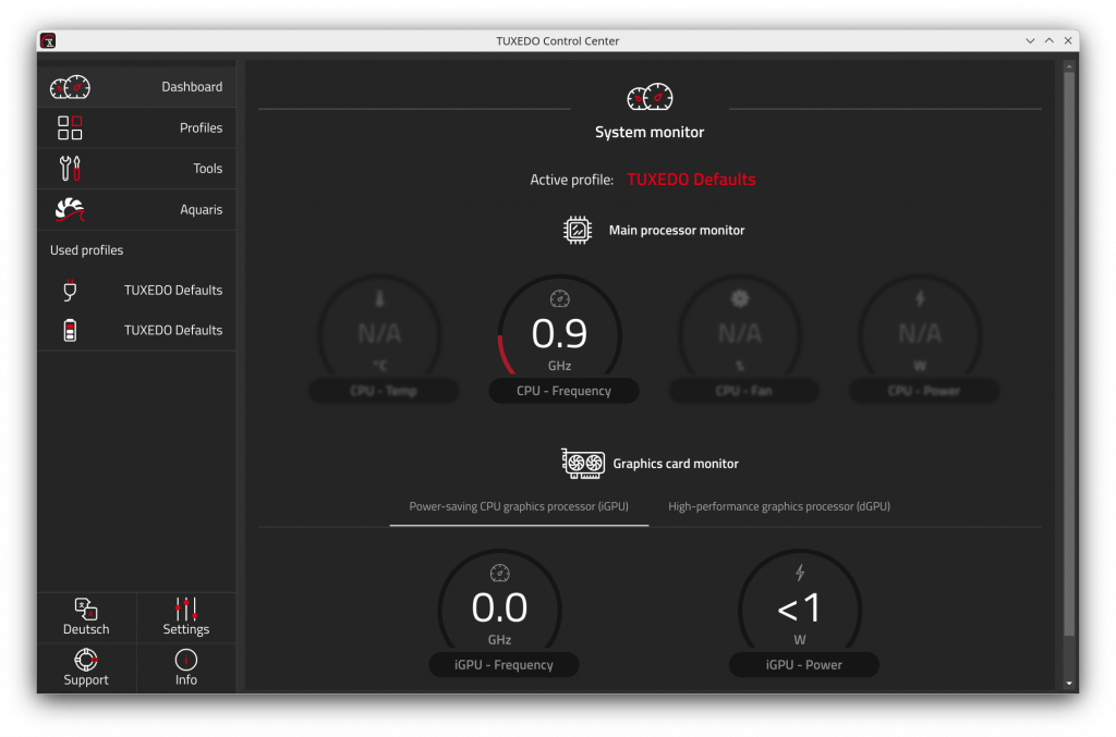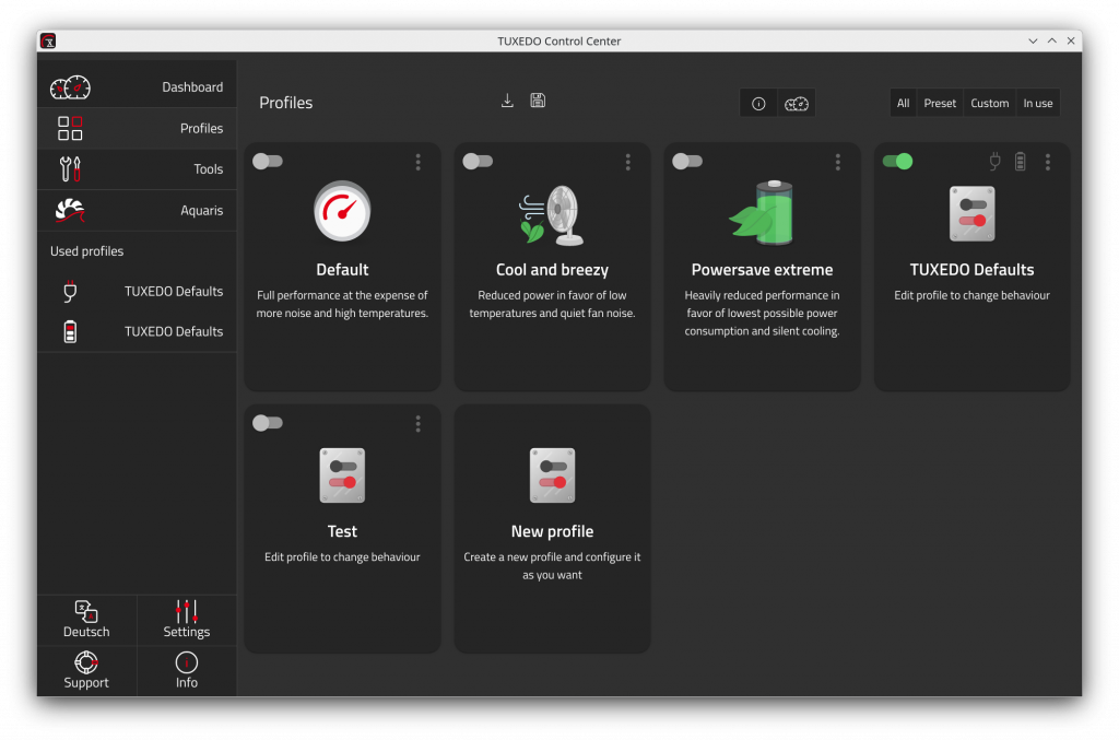 Kaj je še drugače oziroma edinstveno za TUXEDO OS? Nameščena je nadzorna plošča TUXEDO Control Center (TCC), ki ti omogoča nadzor nad delovanjem strojne opreme. Pregleduješ lahko temperaturo procesorja, hitrost ventilatorjev, porabo virov in podobno. S TCC-jem lahko tudi hitro spreminjaš zmogljivostne profile. Skratka, na voljo ti da določene funkcije, ki jih običajno najdeš v BIOS-u ali pri drugih namenskih orodjih. In to v obliki, ki je bolj pregledna in razumljiva. Pogrešam pa, da lahko v TCC-ju ročno nastavljam krivuljo ventilatorjev. Funkcija očitno je na voljo, vendar je pri meni ne morem vklopiti. Ustvariš lahko nove profile, vendar lahko spreminjaš samo frekvenco procesorja (min, max), porabo pri različnih limitih (P1, P2 …) in TGP grafične kartice.