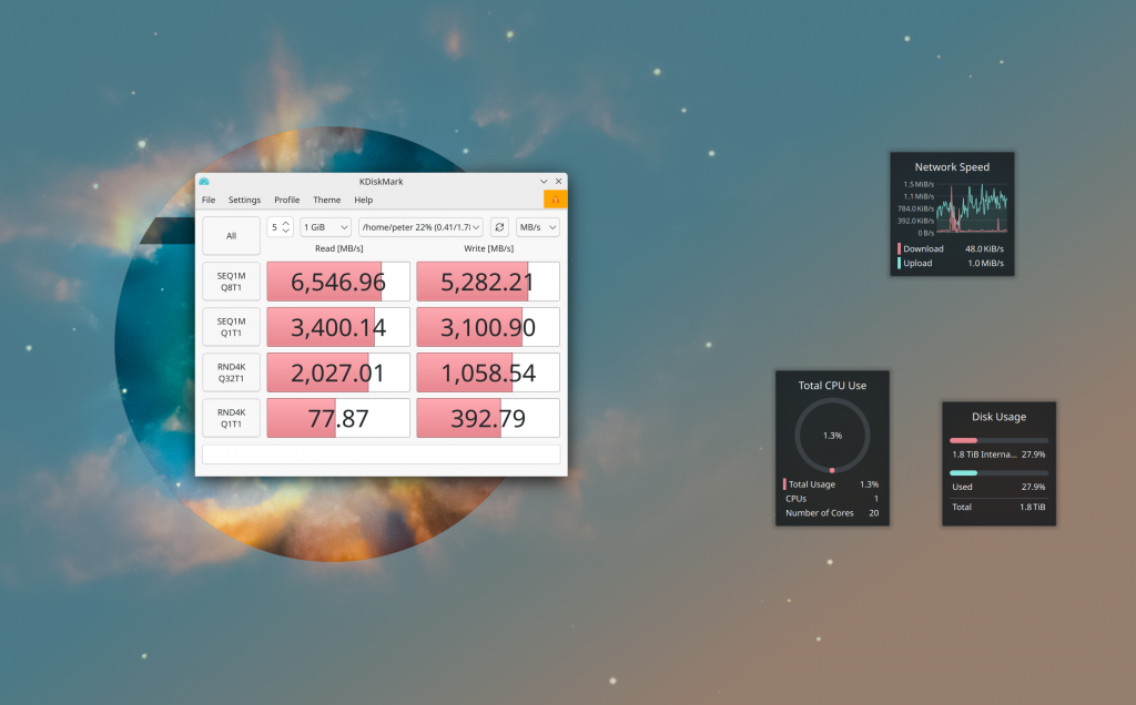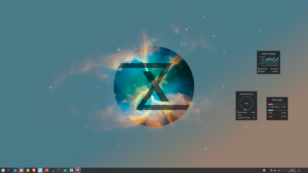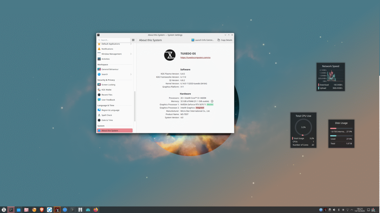 Ker je Plasma zelo nastavljiv, lahko napredni uporabniki poljubno prilagodijo sistem, od videza do funkcionalnosti. Sam sem recimo prilagodil bližnjice na tipkovnici in dodal widget za spremljanje porabe CPU in RAM. Za običajnega uporabnika pa je pomembno, da sistem deluje »out-of-the-box«. In tu TUXEDO OS res blesti, prednameščene so vse ključne aplikacije za vsakdanjo rabo, na primer Firefox, LibreOffice in podobno. Tudi VirtualBox (za ustvarjanje virtualnih okolij) je privzeto nameščen, čeprav to ni standardna praksa. V repozitoriju sem takoj našel Lutris in Heroic Game Launcher, ki jih večina uporablja za namestitev in zagon iger (prek Steama, Epic Games …) in pa RustDesk, ki ga uporabljam za povezovanje na daljavo.