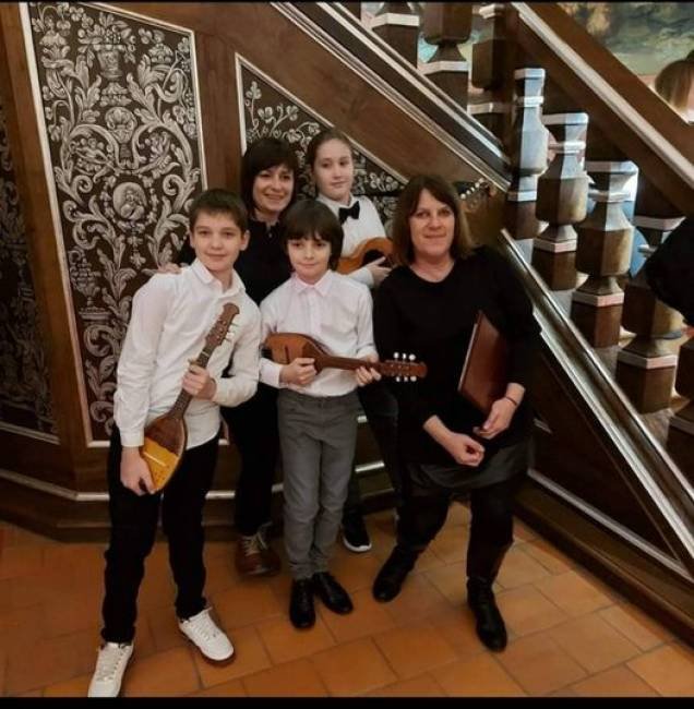 Patrik Strniša, Daniel Rožman in Nino Martinovič (vsi trije tamburica) z mentorico Anamarijo Šimičić in korepetitorko Pierino Cavaliere Mršić