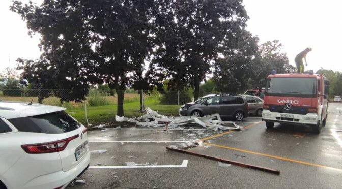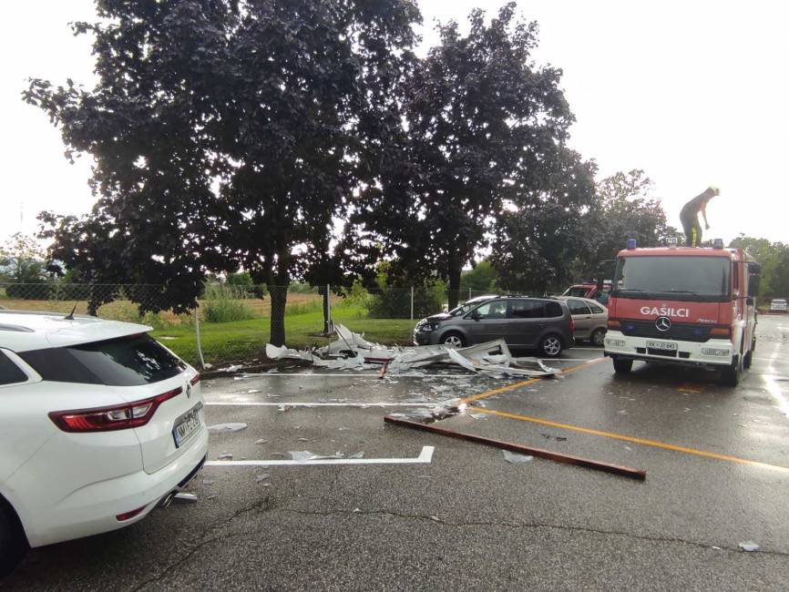 Na cesti proti Gazicam je okoli 15.45 padlo drevo na osebno vozilo. Pri tem sta se poškodovali dve osebi, ki so jih pred prihodom PGE Krško iz vozila potegnili očividci, poklicni gasilci pa so jima nudili prvo pomoč do prihoda reševalcev NMP Brežice.