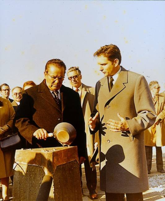 »Želim, da bi nova centrala uspešno opravila svojo nalogo,« je ob položitvi temeljnega kamna izjavil takratni predsednik SFRJ Josip Broz Tito. S tem protokolarnim dejanjem se je končal desetletni proces sprejemanja odločitev slovenskega in hrvaškega elektrogospodarstva, povezanih z gradnjo prve jugoslovanske jedrske elektrarne. Slovesnost, na katero je prišlo po navedbah, ki jih najdemo v takratnih medijih, med 10.000 in 15.000 ljudi, je 1. decembra 1974 ob 11.30 potekala na polju, ki se je v poznojesenskih dneh že spreminjalo v izjemno veliko gradbišče.