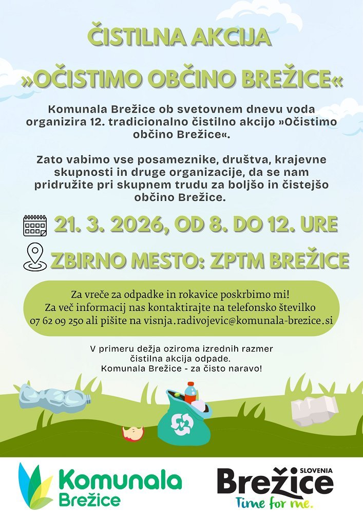 Javno podjetje Komunala Brežice ob svetovnem dnevu voda organizira 12. tradicionalno čistilno akcijo »Očistimo občino Brežice«. Občina Brežice je zelena destinacija in ponosni smo, da skupaj skrbimo za naše okolje. Prav je, da ohranjamo naravo čisto ter soustvarjamo prostor, v katerem se dobro počutimo. Če se mi tukaj počutimo dobro, se bodo prijetno počutili tudi naši obiskovalci. Zato vabimo vse posameznike, društva, krajevne skupnosti in druge organizacije, da skupaj zavihamo rokave in prispevamo k čistejši ter lepši občini.