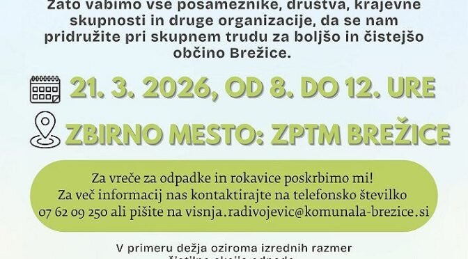 Čistilna akcija bo potekala v SOBOTO, 21. 3. 2026, od 8.00 do 12.00, začela pa se bo pred stavbo Zavoda za podjetništvo, turizem in mladino (ZPTM) Brežice.