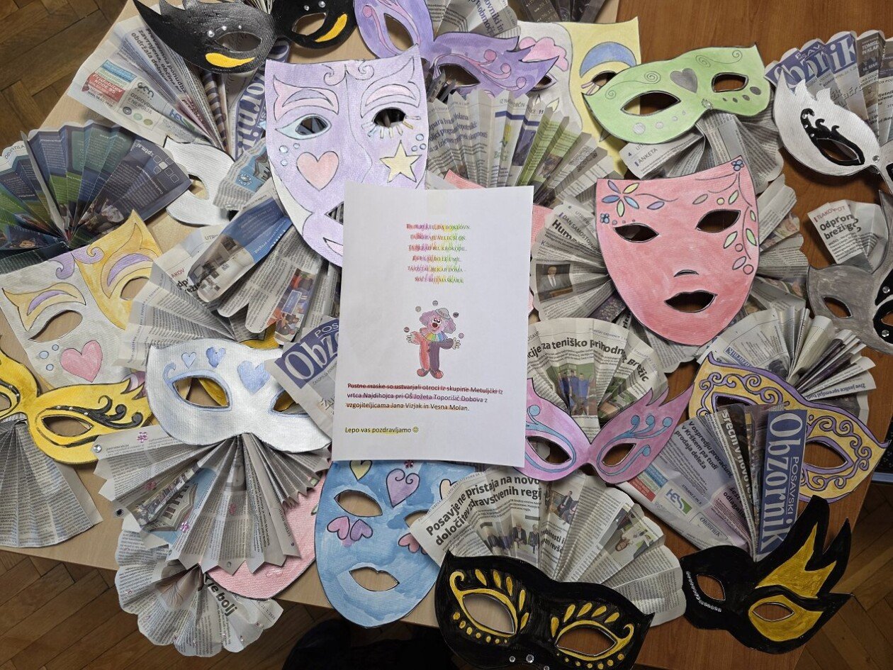 Da smo na Fašjenk res dobro pripravljeni, dokazujejo tudi naši hodniki, ki so že odeti v pravo pustno vzdušje. Letošnje maske imajo lokalno noto, saj so otroci iz skupine Metuljčki iz vrtca Najdihojca pri OŠ dr. Jožeta Toporišiča Dobova raziskovali Posavski obzornik, izbirali teme iz okolja Občine Brežice in jih na igriv, ustvarjalen način prenesli v svoje pustne izdelke.