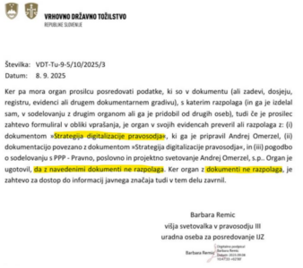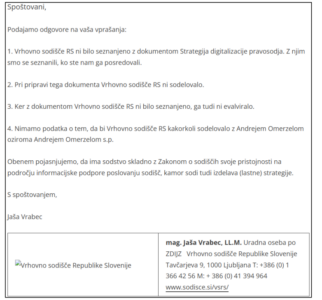 Kaj je spornega z več deset tisoč evrov vredno Omerzelovo pogodbo? Praktično vse! Omerzel je namreč v okviru svojih “storitev” izdal celo vrsto poročil, v katerih je navajal usklajevanje na temo digitalizacije z deležniki na področju pravosodja – torej sodišči, tožilstvom in državnim odvetništvom. Za teh skoraj 50 tisočakov pa bi naj izdelal tudi strategijo digitalizacije pravosodja v Sloveniji. In tukaj se dvojec Švarc Pipanova in Omerzel zatakne. Vrhovno sodišče RS in Vrhovno državno tožilstvo sta Civilni iniciativi aktivni državljani Slovenije, ki se poglobljeno ukvarja s to zadevo, potrdili, da z Omerzelovim pregrešno dragim dokumentom “Strategija digitalizacije pravosodja” sploh nista bili seznanjeni in pri pripravi nista sodelovali, kakor tudi ne s pogodbenikom Andrejem Omerzelom. V številnih delovnih poročilih, ki jih je Omerzel pravosodnemu ministrstvu prilagal k računom za plačilo njegovih storitev, omenja prav sodelovanje s pravosodnimi deležniki, kateri pa o tem očitno niso vedeli ničesar. Še več, pregled dokumenta, ki naj bi predstavljal Strategijo digitalizacije pravosodja, kaže, da gre za povsem vsebinsko prazen in strokovno zgrešen dokument, ki ni usklajen niti z nacionalnimi, kaj šele z veljavnimi smernicami na ravni EU. Neuporaben dokument, za katerega je Švarc Pipanova namenila vrtoglavih 50.000 evrov, je vreden torej več kot 30 povprečnih slovenskih neto plač.