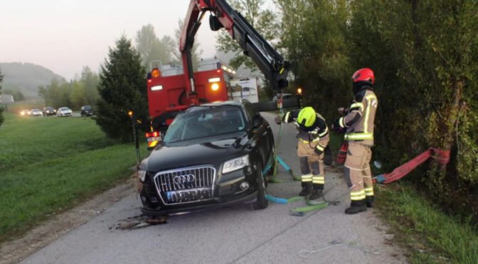 Na intervencijo smo izvozili z dvema voziloma in tremi gasilci-tehničnimi reševalci. Po prihodu na kraj smo ugotovili, da je bila poškodovana oseba že izven vozila, osebno vozilo pa je obstalo prevrnjeno na strehi v obcestnem jarku.
