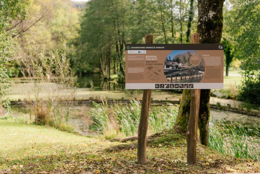 Tik ob Info centru se razprostira ribnik Trebče, ki je najpomembnejše mrestišče za dvoživke tega območja, zato ni naključje, da je Žabja domačija našla svoje mesto prav tu. Spomladi pridejo sem odlagat mreste krastače in rjave žabe, občasno pa opazimo tudi kakšnega pupka. Okoli ribnika je urejena slikovita učna pot, kjer lahko s pomočjo informativnih tabel in strukturnih elementov spoznavamo življenjski prostor dvoživk ter sledimo njihovemu življenju skozi celo leto.