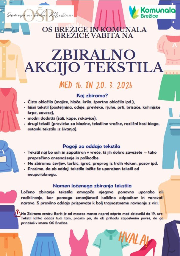 V sodelovanju z Osnovno šolo Brežice organiziramo zbiralno akcijo odpadnega tekstila, s katero želimo spodbuditi pravilno ravnanje s tekstilom ter povečati količine ločeno zbranega tekstila.