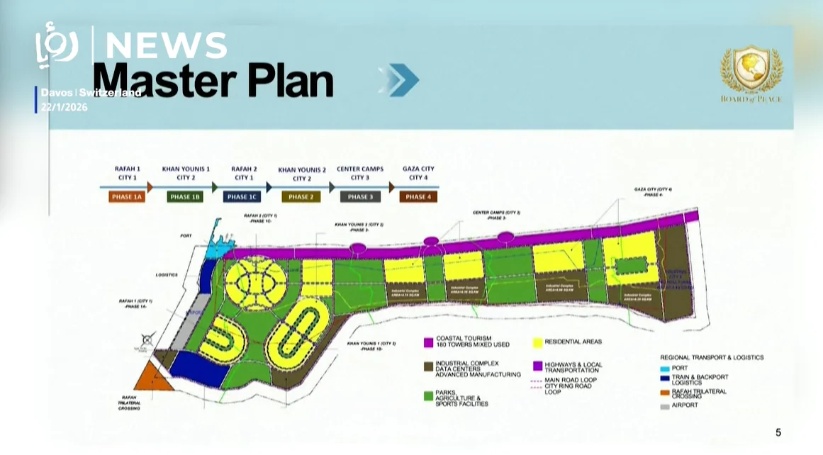 Ameriški predsednik Donald Trump je na Svetovnem gospodarskem forumu v Davosu predstavil ambiciozno vizijo za popolno obnovo Gaze, ki bi vojno opustošeno območje spremenila v moderno obalno središče z nebotičniki, turističnimi conami in novimi mesti.